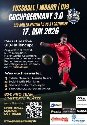 Göttingen, April 2026 – Nach zwei erfolgreich durchgeführten Turnieren geht der GoCupGermany in die nächste Runde: Am 17. Mai 2026 findet die 3. Auflage des Jugendfußballturniers in der IGS Sporthalle Göttingen-Geismar statt. Aufgrund der hohen Nachfrage sind aktuell nur noch wenige Startplätze verfügbar.