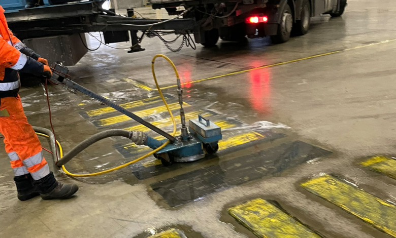 Hochdruck-Wasserstrahltechnik entfernt Bodenmarkierungen