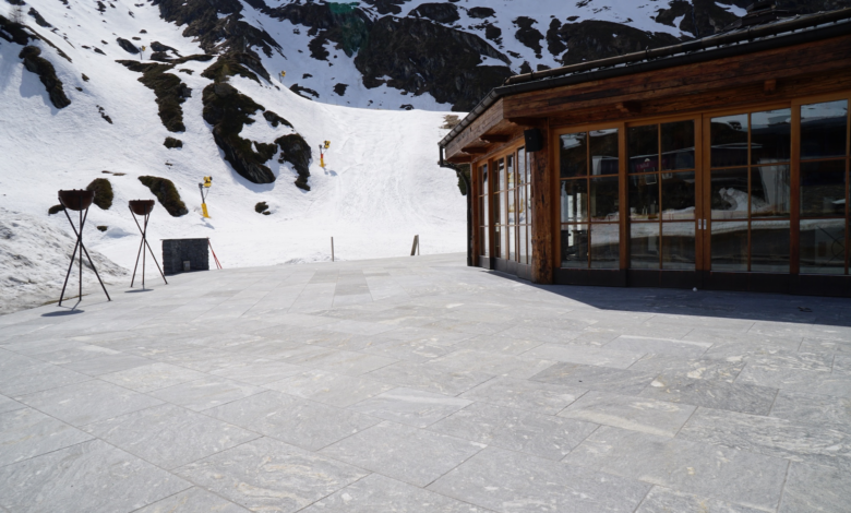 Dass dieses Prinzip auch unter extremen Bedingungen funktioniert, zeigt ein Blick nach Kaprun in Österreich. Die Terrassen der beliebten Almhütte Häuslalm am Kitzsteinhorn liegen in hochalpiner Lage und sind extremen Witterungseinflüssen ausgesetzt. Hier treffen lange Frostperioden auf intensive Sonneneinstrahlung und hohe Feuchtebelastung durch große Mengen Regenwasser, das über die Fugen in die Konstruktion gelangt – eine echte Bewährungsprobe für jeden Terrassenaufbau. Dennoch präsentieren sich die Beläge dort dauerhaft stabil und optisch hochwertig.