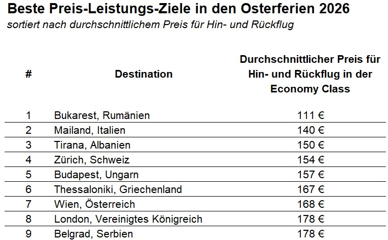 Fans von Städtetrips kommen in den diesjährigen Osterferien voll auf ihre Kosten. Viele europäische Metropolen gehören zu den günstigsten Destinationen in den Frühlingsferien. Am günstigsten lässt sich die rumänische Hauptstadt Bukarest erreichen. Hin- und Rückflug kosten in der Ferienzeit momentan durchschnittlich 111 Euro. Ein Flugticket für die italienische Modestadt Mailand kostet in den Osterferien im Schnitt 140 Euro pro Person. Auf Platz drei der Preis-Leistung-Destinationen landet die albanische Hauptstadt Tirana. Für Hin- und Rückflug zahlen Osterreisende zurzeit im Schnitt 150 Euro.