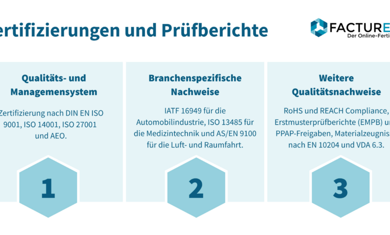 Über die DIN EN ISO 9001-Norm hinaus bietet das Unternehmen seinen Kunden branchenspezifische Nachweise, welche die Fertigungspartner bei Bedarf bereitstellen: beispielsweise IATF 16949 für Automotive, ISO 13485 für Medizintechnik oder AS/EN 9100 für Luft- und Raumfahrt. Darüber hinaus sichern Compliance-Standards wie RoHS und REACH sowie Erstmusterprüfberichte (EMPB) und PPAP-Freigaben die Übereinstimmung mit Bestellspezifikationen. Materialzeugnisse nach EN 10204 belegen Herkunft und Eigenschaften des eingesetzten Materials.