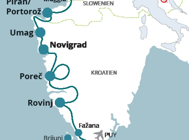 Drei Länder, eine Reise – abwechslungsreiche Etappen Die Radtour ist in gut planbare Tagesetappen zwischen etwa 20 und 65 Kilometern unterteilt und richtet sich an Genussradler. Die Strecke verläuft leicht hügelig und bietet eine ausgewogene Mischung aus Küstenwegen und Passagen durch das Hinterland. Zu den Höhepunkten zählen bekannte Orte wie Piran, Umag, Poreč, Rovinj und schließlich Pula. Unterwegs entdecken Radreisende unter anderem die traditionellen Salzgärten von Sečovlje sowie die Euphrasius-Basilika in Poreč, die zum UNESCO-Weltkulturerbe gehört. Den Abschluss bildet Pula mit seinem eindrucksvollen römischen Amphitheater, einem der bedeutendsten historischen Bauwerke der Region.