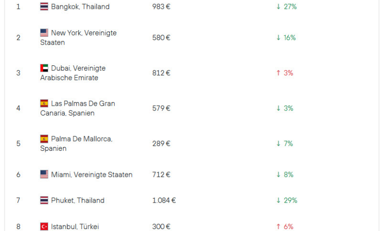 Gleichzeitig zieht es die Deutschen in diesem Jahr generell besonders oft in die Ferne: Fünf der zehn meistgesuchten Destinationen liegen außerhalb Europas. Neben der Top Drei vervollständigen Miami und Phuket Stadt die Liste. Zu den meistgesuchten innereuropäischen Zielen gehören Gran Canaria, Mallorca, Istanbul, London und Teneriffa.