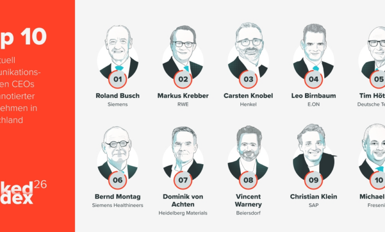 Busch ist nicht das einzige neue Gesicht in der Top 10. Leo Birnbaum von E.ON und Vincent Warnery von Beiersdorf rücken deutlich nach vorn, Bernd Montag von Siemens Healthineers kehrt in die Top 10 zurück. Birnbaum steigert seine Interaktionen um fast ein Drittel und wächst zugleich deutlich bei den Followern. Warnery profitiert von einer ausbalancierten Interaktionsstrategie zwischen Community Management und Diskurs. Bernd Montag legt sowohl bei der Audience Activity als auch bei der Interaktion im Netzwerk klar zu. Die Top 10 von 2025 komplettieren Tim Höttges (Telekom), Dominik von Achten (Heidelberg Materials), Christian Klein (SAP) und Michael Sen (Fresenius).