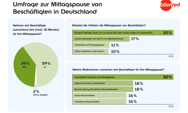 Befragte klare bzw. flexiblere Pausenzeiten. Für zu viele Erwerbstätige ist die Mittagspause zu kurz und eine finanzielle Belastung. Essenszuschüsse sind ein einfacher und flexibler Weg, die Pausenkultur zu stärken – sowohl im Büro als auch im Homeoffice”, sagt Nicole Mantow, Geschäftsführerin von Edenred Deutschland.