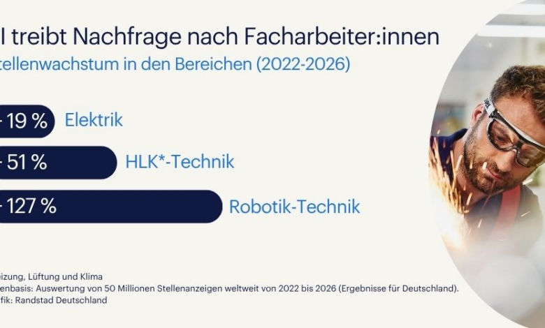 Eschborn, April 2026 – Künstliche Intelligenz (KI) krempelt den Arbeitsmarkt um – dabei stehen häufig Berufsfelder im Fokus, die durch KI ersetzt werden könnten, insbesondere Bürojobs und Wissensarbeit. Doch KI ist ebenfalls ein Treiber von Stellenwachstum in technischen und handwerklichen Berufen. Dies zeigt eine neue Auswertung von mehr als 50 Millionen Stellenanzeigen weltweit durch den Personaldienstleister Randstad.