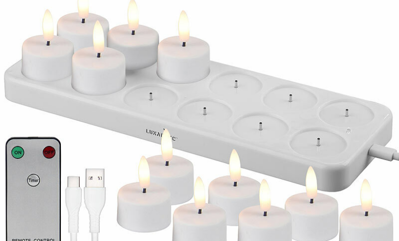 – 12er-Set wiederaufladbare LED-Teelichter mit realistischer Docht-Flammenoptik
