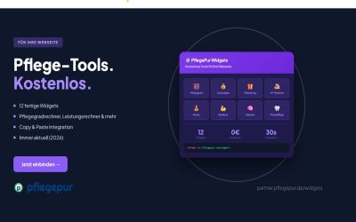 Hameln, 30. Januar 2026 – Das Healthtech-Startup PflegePur aus Hameln stellt ab sofort 12 kostenlose Pflege-Widgets für Webseiten bereit. Pflegestützpunkte, Pflegedienste, Pflegeberater und Seniorenportale können die Tools per Copy & Paste auf ihrer Webseite einbinden – ohne Kosten, ohne Registrierung, ohne technische Vorkenntnisse.
