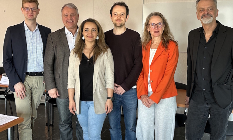 Bildunterschrift: V.l.n.r. Marvin Höweler (Rhein-Sieg-Kreis), Rainer Viehof (Bürgermeister Gemeinde Eitorf), Lydia Reinhardt & Leon Wenigenrath (Wirtschaftsförderung Gemeinde Eitorf), Christine Lötters (SC Lötters), Andreas Bachmann (Planungsbüro Pesch Partner Architektur Stadtplanung GmbH)