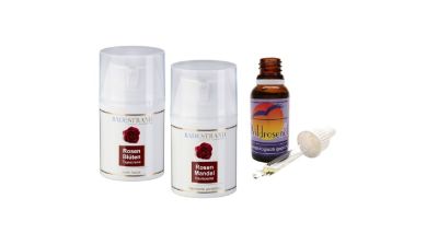 Die Rosenblüten-Tagescreme ist eine schnelleinziehende, leichte Gesichtspflegecreme auf pflanzlicher Basis für die anspruchsvolle, zu Trockenheit neigende Haut. Wesentlich reichhaltiger ist die pflanzenbasierende Gesichtspflege mit der Rosenmandel-Nachtcreme für die erholsamen und regenerativen Nachtstunden. Sowohl zur Pflege des Dekolletés als auch zur Behandlung von Narben, Schwangerschafts- und Dehnungsstreifen bietet sich das hochfeine Wildrosen-Hautöl an. Ein optimales Pflegeergebnis erreichen Sie bei der Anwendung auf der nach dem Duschen oder Baden noch handtuchfeuchten Haut, hier wird zusätzlich Feuchtigkeit gebunden und die Haut vor Austrocknung geschützt, die Hautelastizität unterstützt und der Hauttonus nachhaltig verbessert.